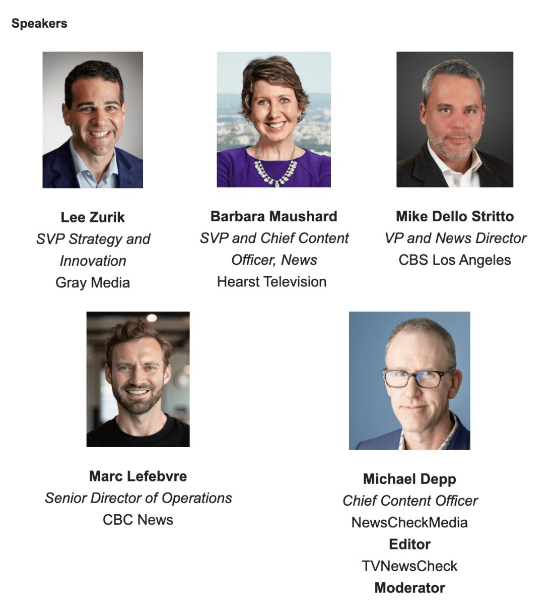 Speakers include Lee Zurik, senior vice president of strategy and innovation at Gray Media; Barbara Maushard, senior vice president and chief content officer for news at Hearst Television; Mike Dello Stritto, vice president and news director at CBS Los Angeles; and Marc Lefebvre, senior director of operations at CBC News. The discussion will be moderated by Michael Depp, chief content officer of NewsCheckMedia and editor of TVNewsCheck.